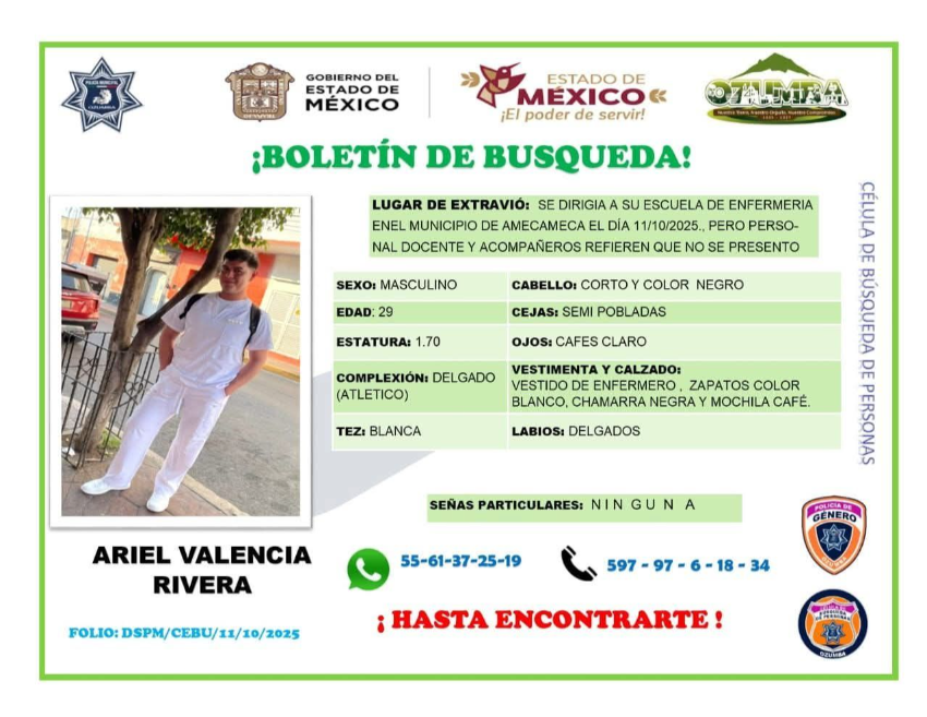 Si tienes información sobre su paradero, comunícate a los números 55 5074 7624 y 597 97 6 1834